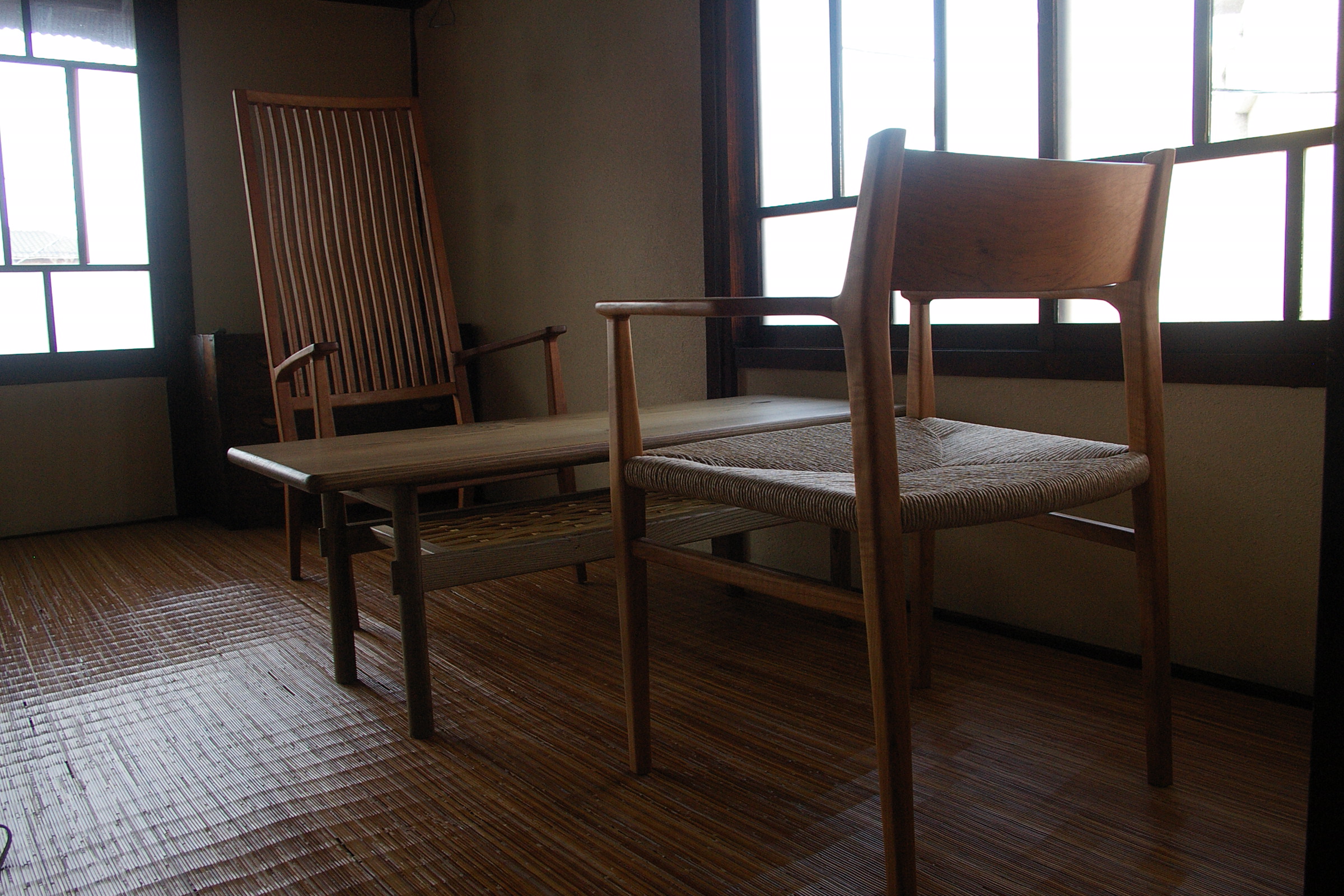 手前からサクラのアームチェアー・神代ニレのテーブル・さくらのハイバックチェアー
